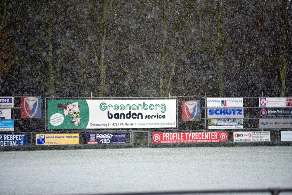 Het gladde veld, bezaaid met hagelstenen, maakte het spel er niet eenvoudiger op. Spelers gleden weg, passes kwamen net niet aan en het tempo lag lager dan normaal. De wedstrijd kabbelde richting de rust met Klundert op voorsprong.